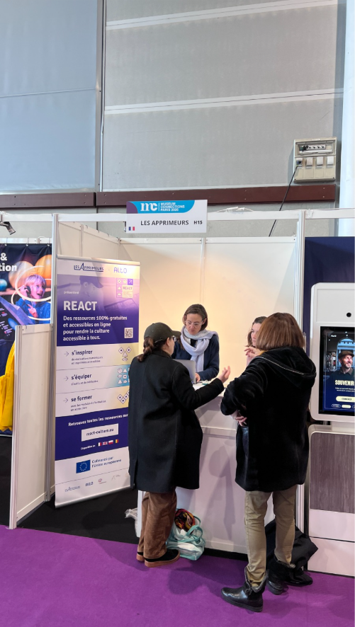 W ramach działań promocyjnych projektu REACT, Les Apprimeurs zaprezentowało projekt podczas konferencji Museum Connections 2026 w Paryżu (13–14 stycznia 2026 r.), przyczyniając się w znacznym stopniu do zwiększenia zasięgu projektu poprzez duże międzynarodowe spotkanie profesjonalistów z dziedziny muzealnictwa, kultury i turystyki. To zyskujące na popularności wydarzenie zgromadziło 6332 uczestników (21% z zagranicy), 403 wystawców (37% z zagranicy), którzy mogli wziąć udział w68 konferencjach, i było doskonałą platformą do dzielenia się podejściem REACT i praktycznymi narzędziami służącymi do integracyjnej mediacji na miejscu i online. Poprzez wymianę informacji na swoim stoisku, Les Apprimeurs zaprezentowało swoją metodologię wdrażania dostępności od samego początku oraz konkretne przykłady dostępnych i łatwych do czytania (ETR) materiałów pomocniczych dla zwiedzających, opracowanych we współpracy z instytucjami partnerskimi, pokazując, w jaki sposób mediacja bez barier poszerza grono odbiorców i wzmacnia rolę obiektów kulturalnych jako przestrzeni uczestnictwa i integracji.