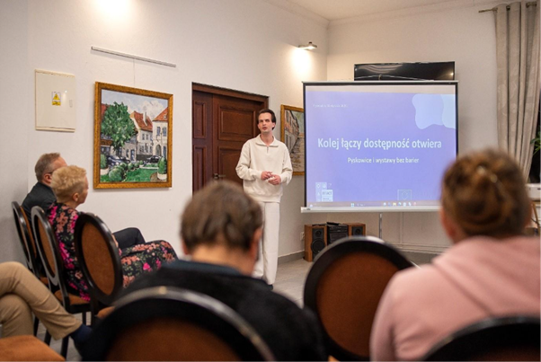 W spotkaniu w Pyskowicach wzięli udział wiceburmistrz miasta, przedstawiciele instytucji i organizacji kulturalnych oraz osoby niepełnosprawne. Wydarzenie pokazało, że dostępność to nie tylko usuwanie barier architektonicznych, ale także świadome projektowanie doświadczeń kulturalnych tak, aby każdy mógł w pełni i z przyjemnością w nich uczestniczyć. Prezentacje ekspertów, poruszające zarówno lokalną historię miasta w kontekście integracyjnych wycieczek opracowanych wspólnie przez Fundację ARTeria, polskiego partnera projektu, we współpracy z MOKiS i Stacją Pyskowice, podkreślały znaczenie uwzględnienia różnorodnych głosów już na etapie planowania i realizacji działań kulturalnych. Piotr Borowiak opowiedział o powstaniu wystawy „Pyskowice Miasto. Od pasji do wystawy”, a Aleksandra Jakubowska z Centrum Wystawienniczego omówiła kwestie wystaw i dostępności w instytucjach kultury. Wenancjusz Ochmann z Fundacji ARTeria przedstawił wyniki projektu REACT. Wenancjusz Ochmann from the ARTeria Foundation presented the results of the REACT project.
